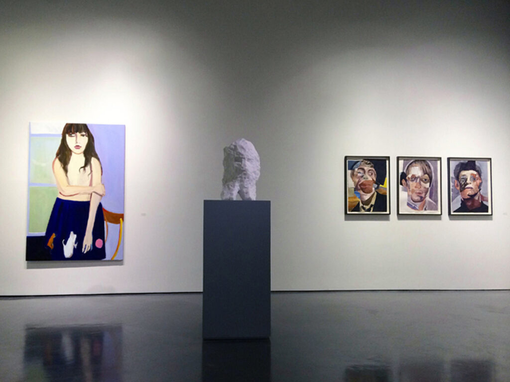 Large Misfit watercolours. On left, painting by Chantal Joffe and on plinth, sculpture by Daniel Silver. Curated by Sacha Craddock. Curated Space in The Threadneedle Prize. Mall Galleries, London, 2014