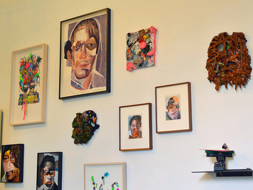 ‘Creative Rage’, curated by Martin Green and James Lawler (Duovision Arts). From left artwork by Duggie Fields, right ‘Misfit (Shadow)’ by David Lock. Stoke Potteries Museum and Art Gallery, 2018